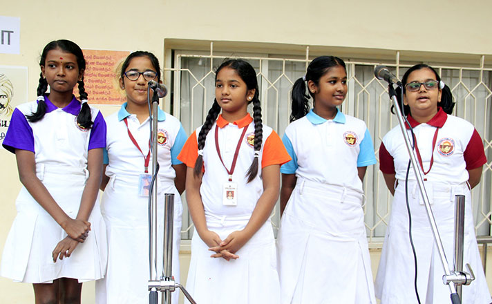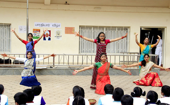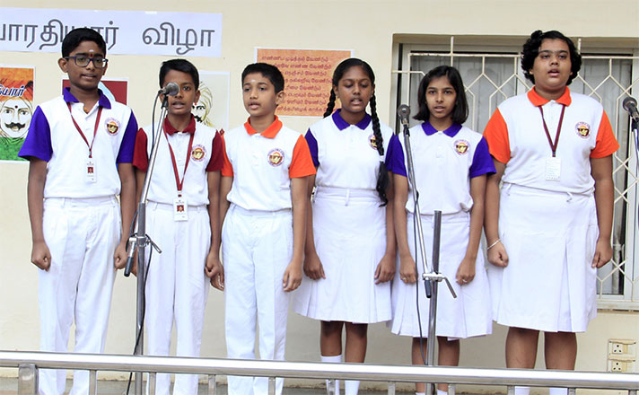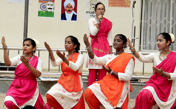 Bharatiyar Vizha celebrations began with Tamizh thai vazhthu. The theme chosen for this year was ‘Women Empowerment in Bharatiyar Songs’. This was followed by a speech and a skit in Tamil explaining the greatness of Subramania Bharati. There was a music medley of bharathiyar songs describing the greatness of our country. The four houses (Brilliance, Eminence, Excellence and Radiance) excelled each other with their brilliant dance performances. The programme ended with a Group dance glorifying Tamil language.