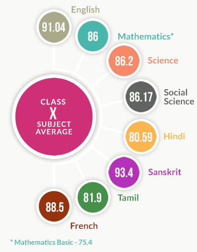 Sarah Shafee Shaik secured 495/500, the highest score in class X. Many students secured centums in English, Mathematics, Sanskrit, French and in Science.