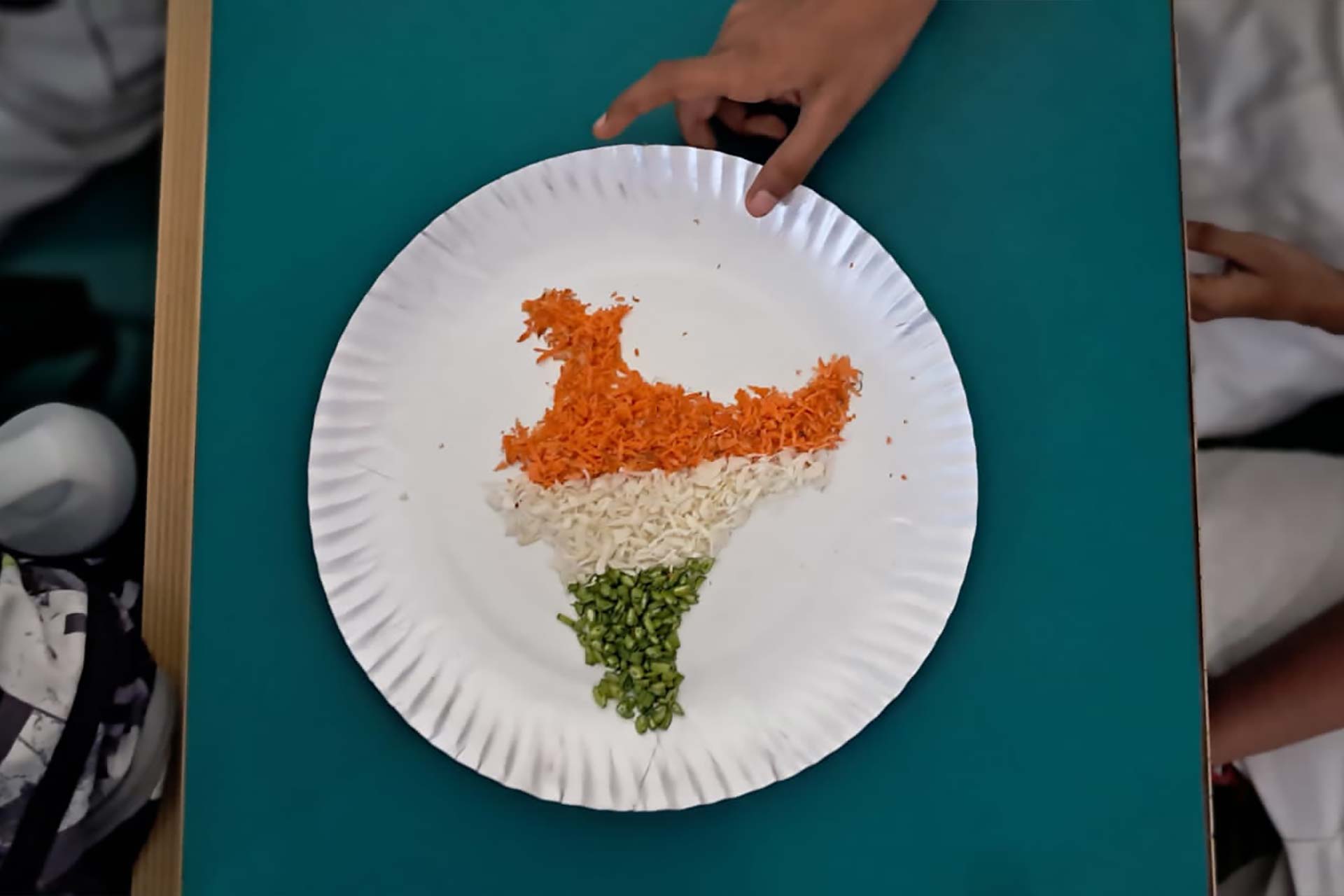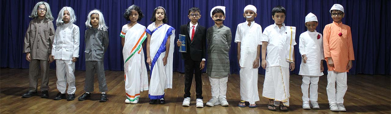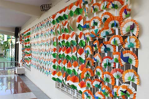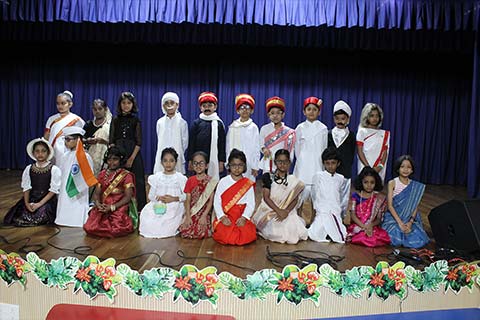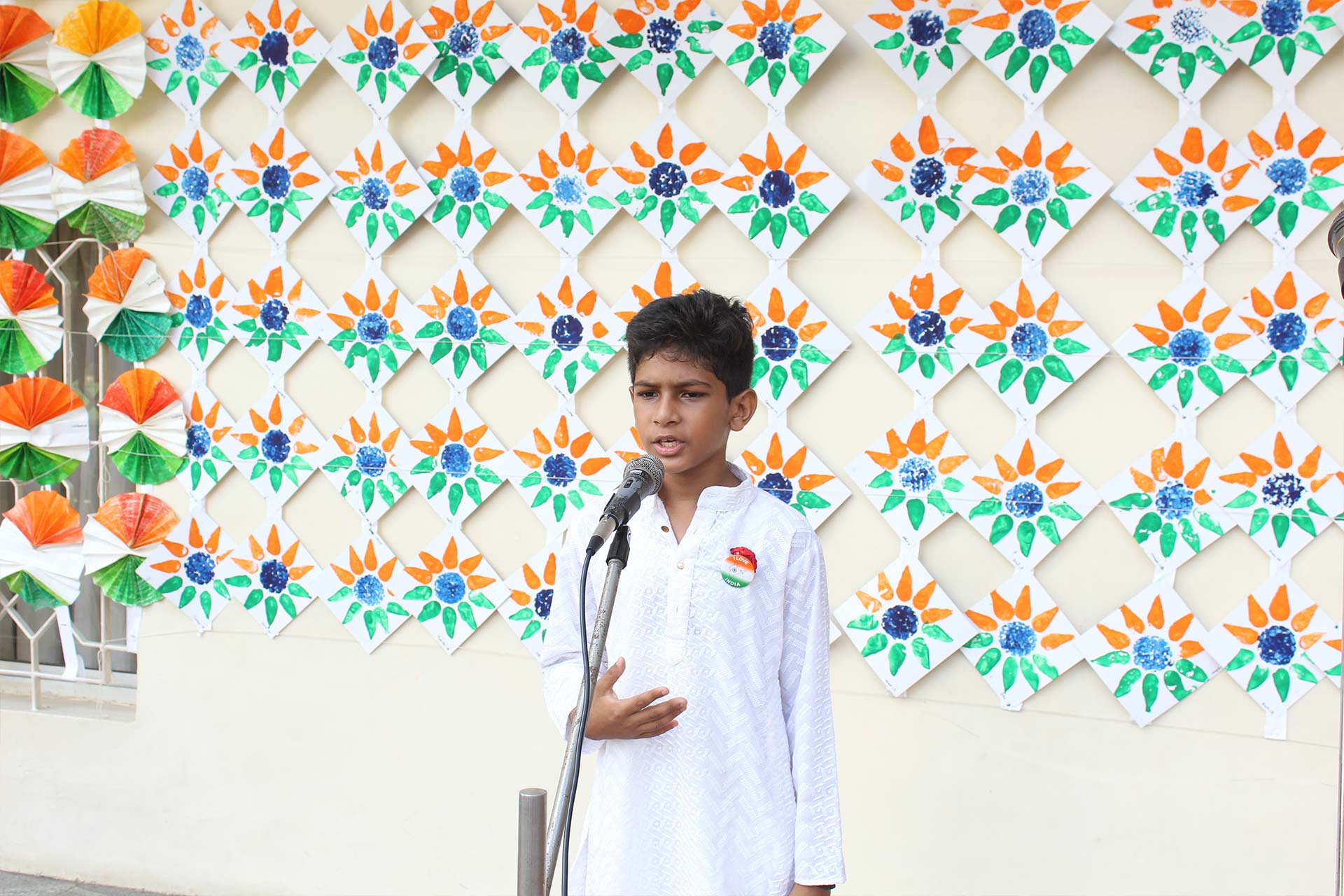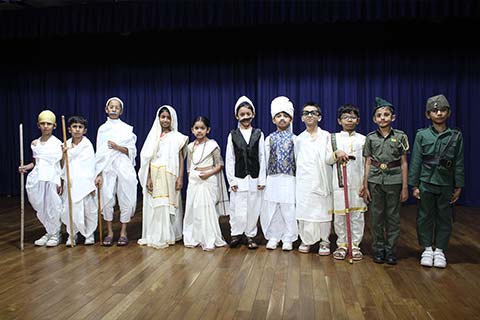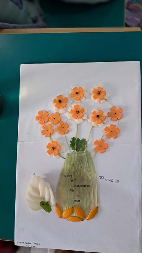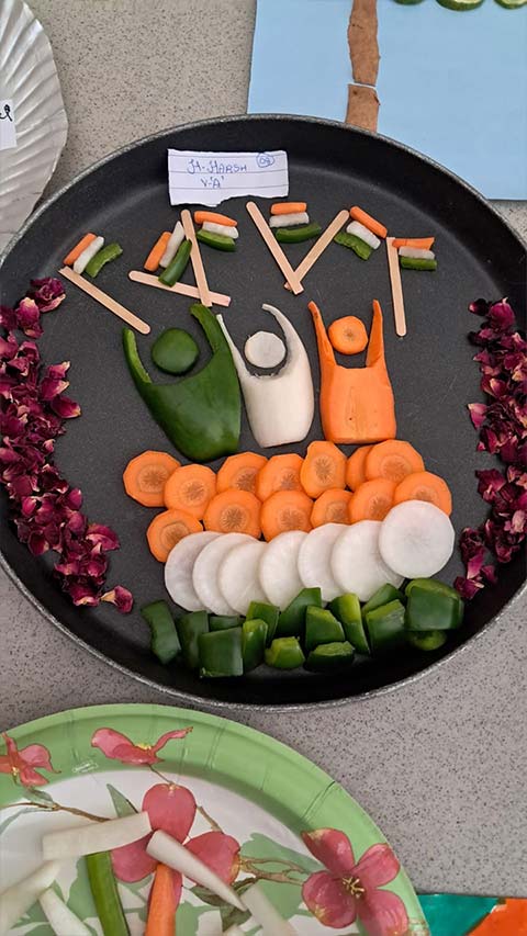 In the run-up to the day various activities were conducted. Vegetable in the tricolor were carved to make beautiful designs by students of grades 3 to 5. Students of grades 1 and 2 portrayed as erstwhile patriotic heroes in the fancy dress show.