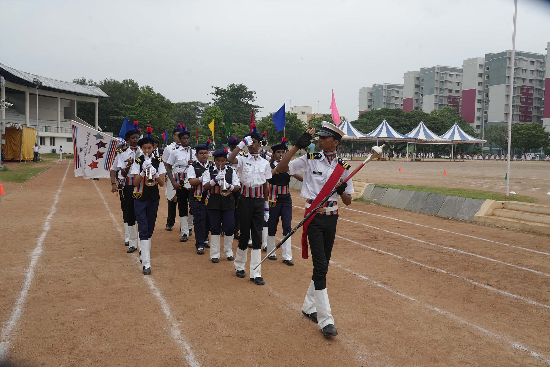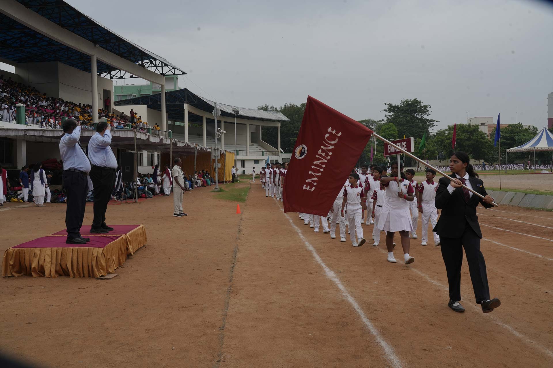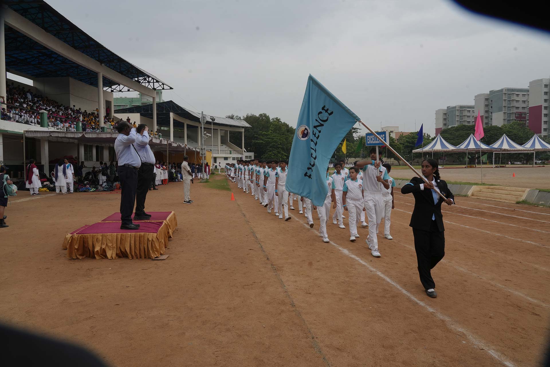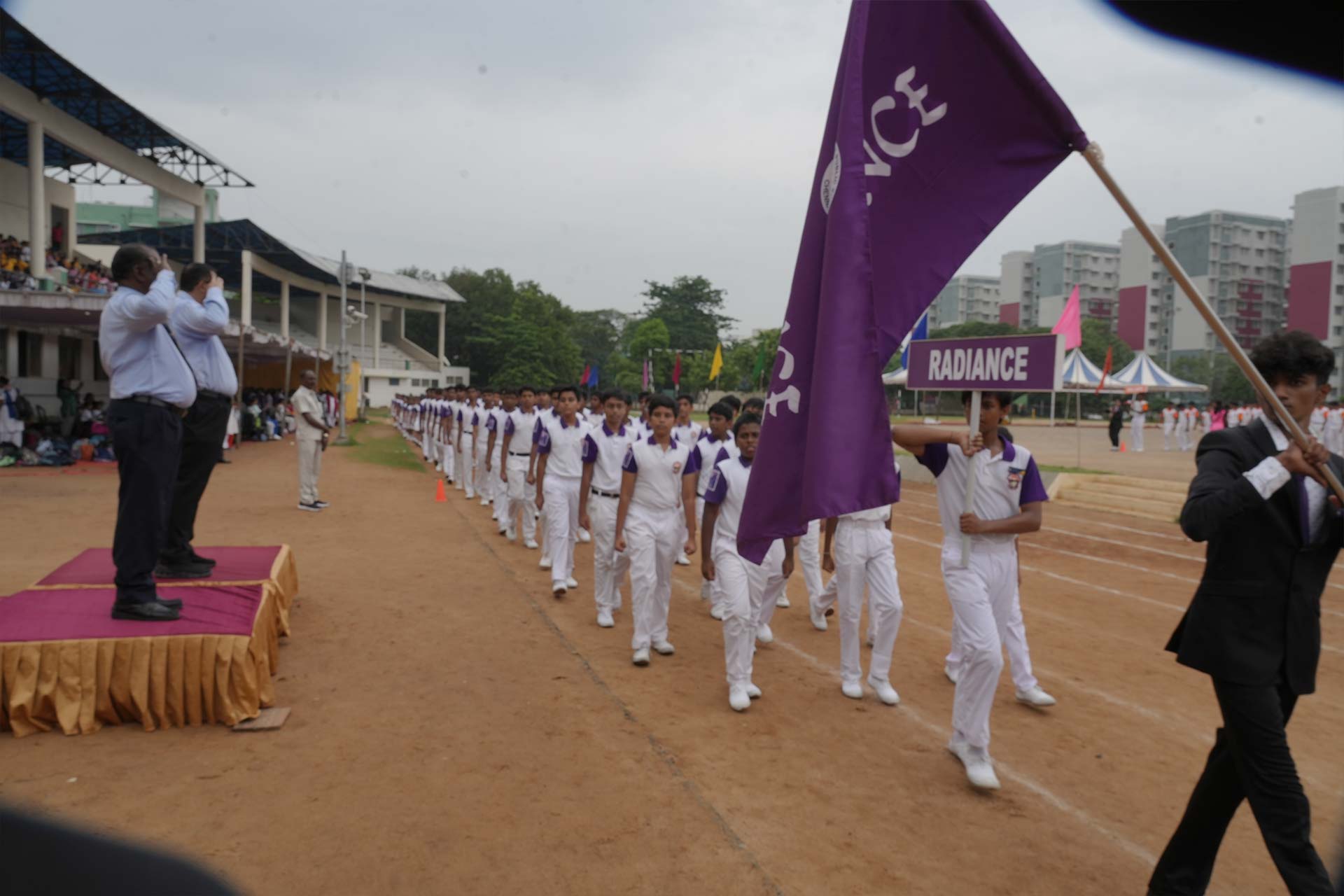 The event commenced with an invocation followed by a warm welcome address by the Principal Mrs. Sujatha Bokka. Mohamed Arshaan Miyan, Sports Secretary, and Rhea Chandra, Assistant Sports Secretary, felicitated the Chief Guest. The Cubs and Bulbuls greeted the Chief Guest, marking the beginning of the grand March Past. The school band showcased their musical talents as the contingents marched forward. The parade was led by the Sports Secretary, Mohamed Arshaan Miyan, along with the School Pupil Leaders, Sai Sharan and Heeba, and the Assistant Sports Secretary, Rhea Chandra. Each house was guided by its captain and vice-captain.