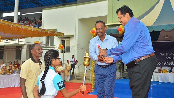 National Public School, Gopalapuram, Chennai, hosted its 50th Annual Sports Meet with great zeal and excitement. The programme commenced with the Principal, Mrs Jayanthi Sampath welcoming the esteemed gathering. The Chief Guest, Group Captain Subramaniam Rajkumar, retired official from the Air Force, in his inaugural speech sports urged the students to do their best and play the game. An alumnus of National Public School, Mr. Rajkumar also spoke about the importance of having self- confidence.